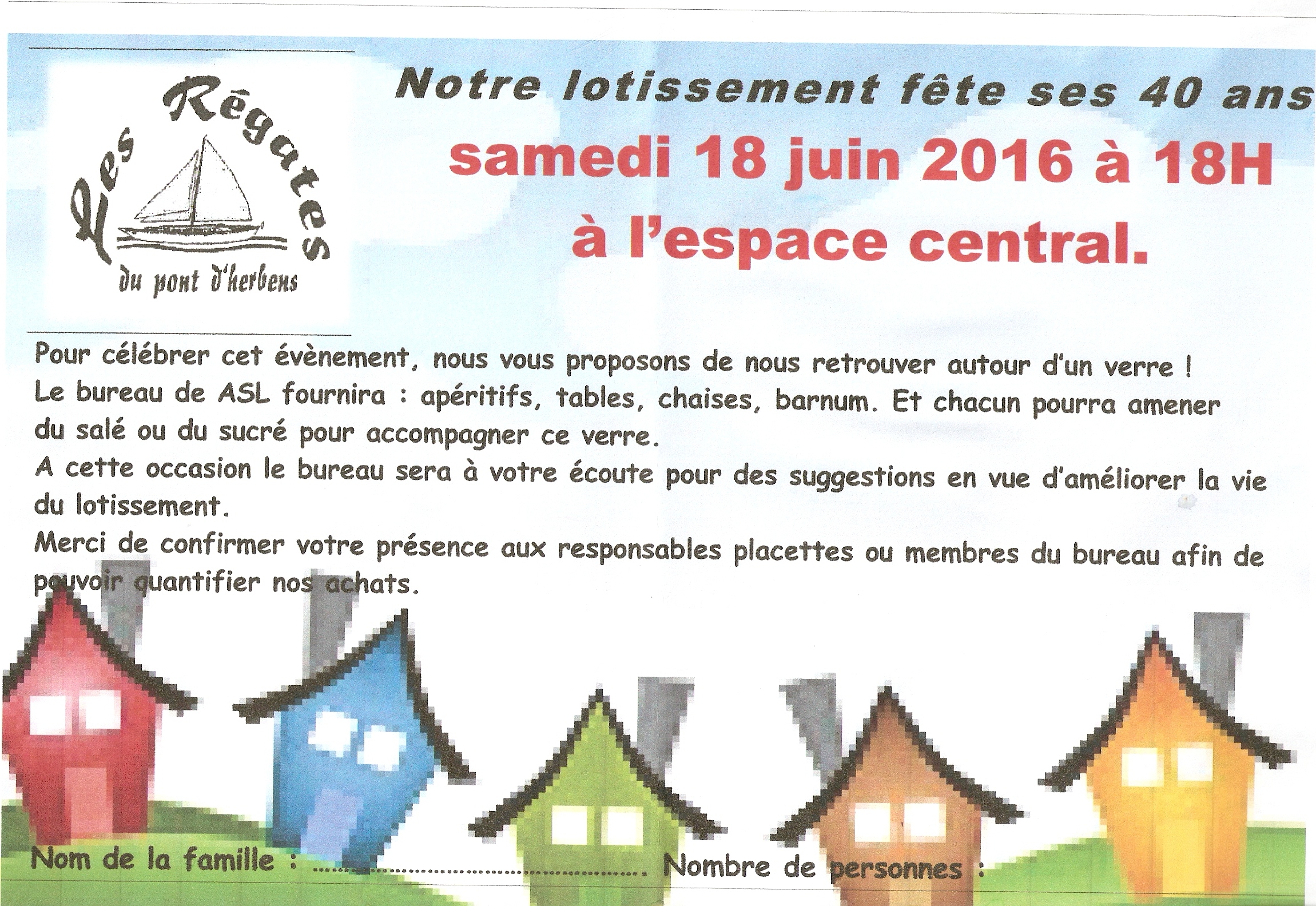 La FETE D’ANNIVERSAIRE DES 40 ANS du lotissement est reportée au Samedi 25 Juin 2016 à 18h00 à l’Espace Central.